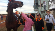 Leonora and a day out at the horse races. The two horses I bet on and won which our friends own. Fiona is receiving the prize of the day with City Plan. The grandstand was something else. It had 4 canvas deck chairs and 4 old padded seats for the 1st class then old wooden planks for the rest. We had a beer with them at their horse float come motor home after the races.